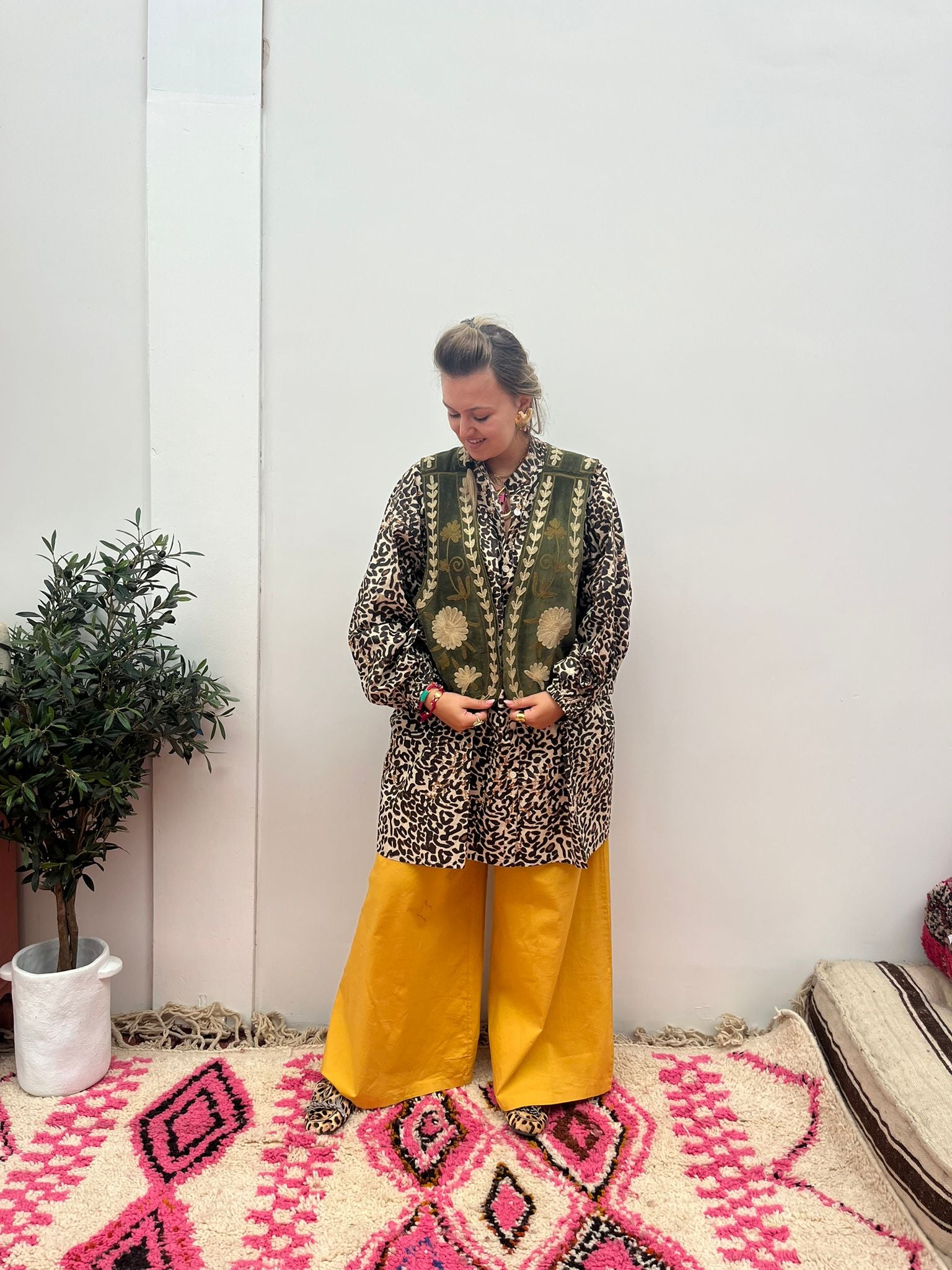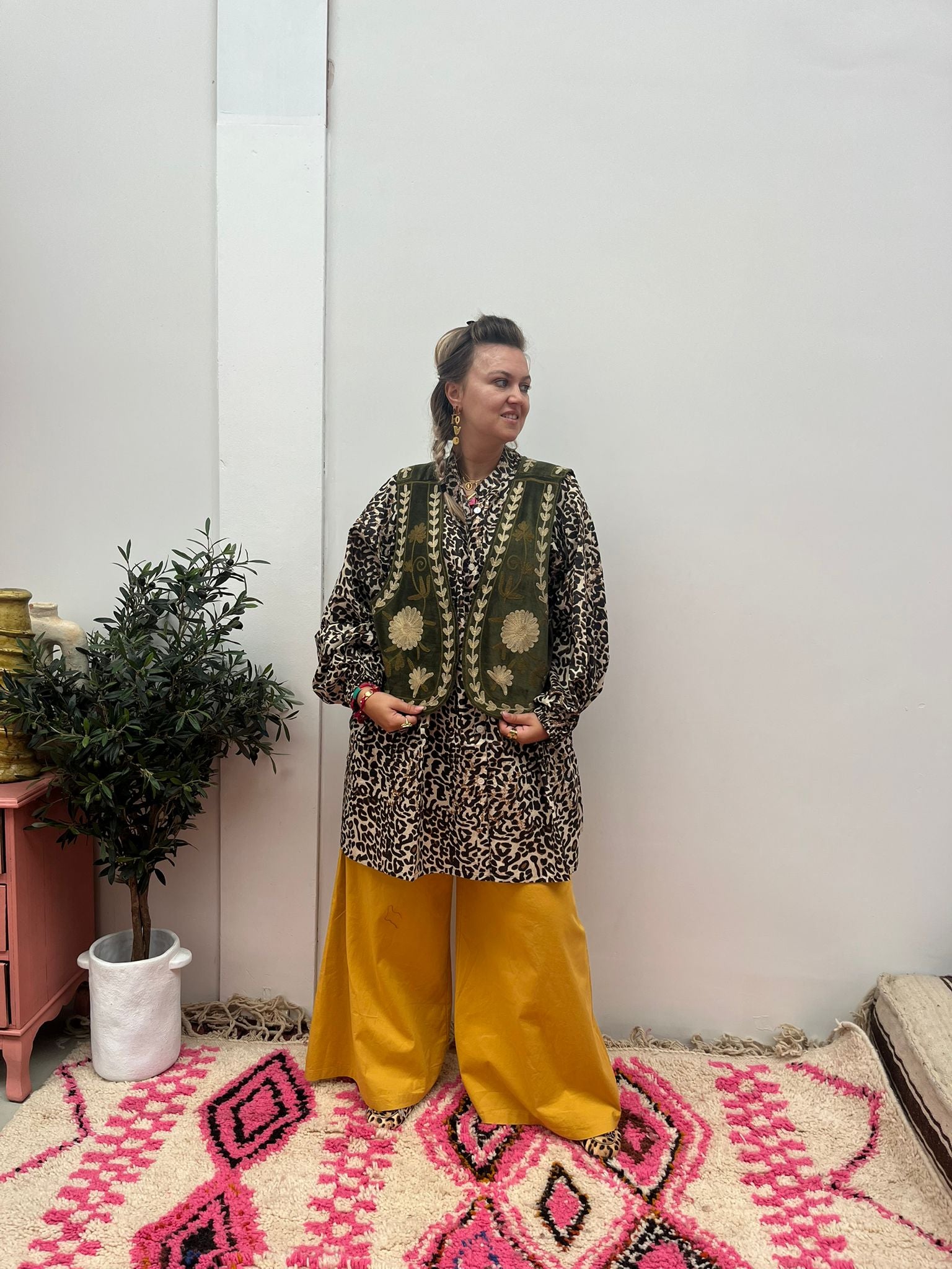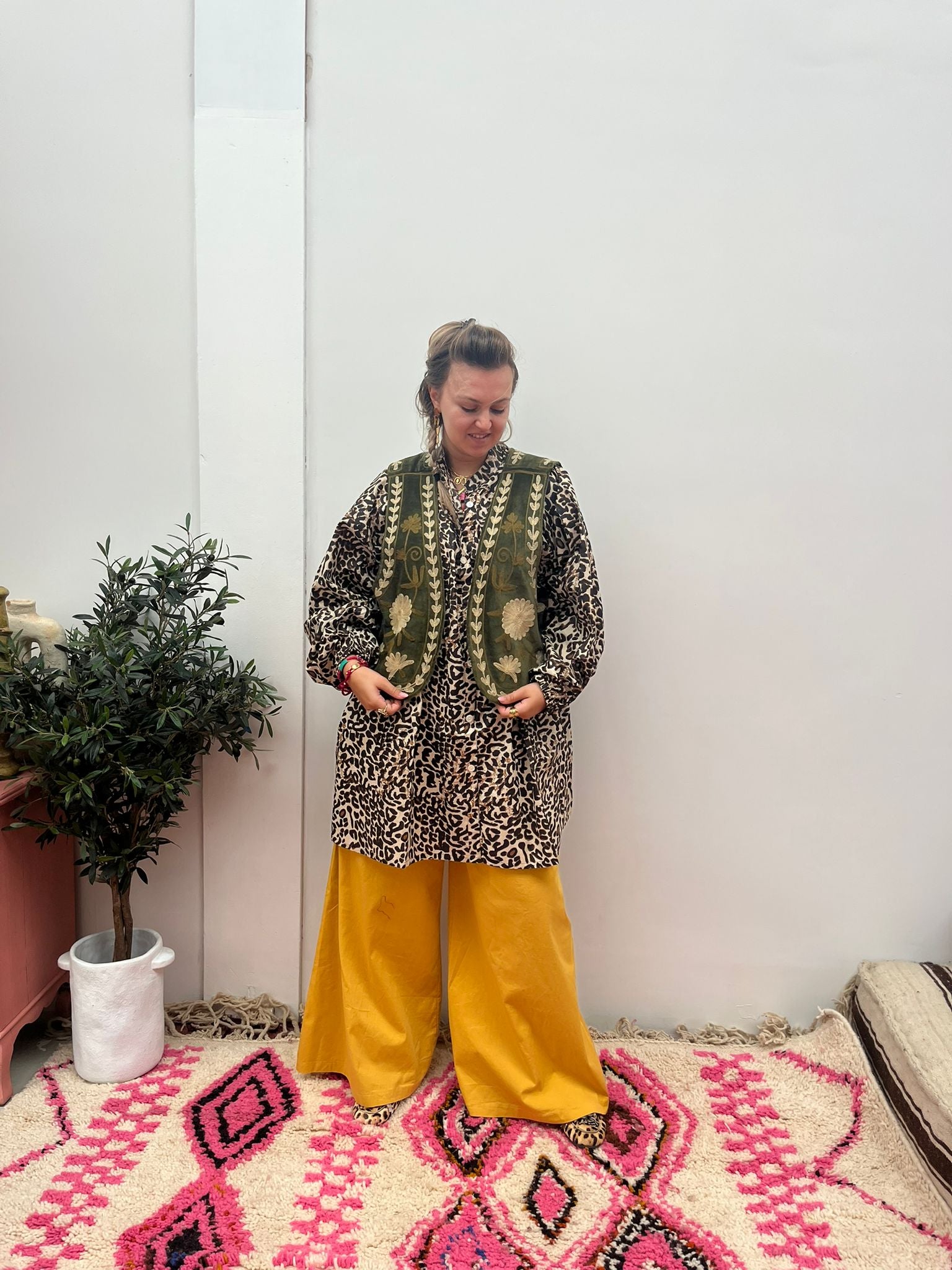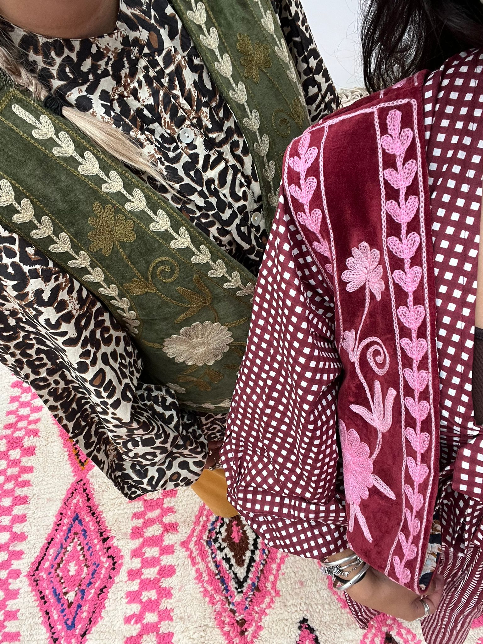 - Veelzijdig: Een Suzani-velvet gilet kan op verschillende manieren worden gestyled. Het kan worden gedragen over een eenvoudige jurk of top voor een vleugje boho-chic, of over een blouse en jeans voor een meer casual look.
