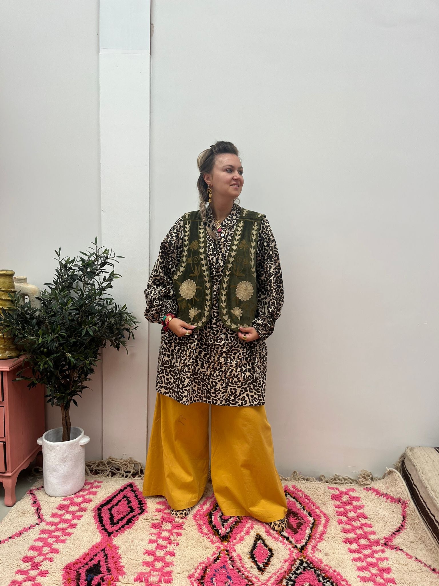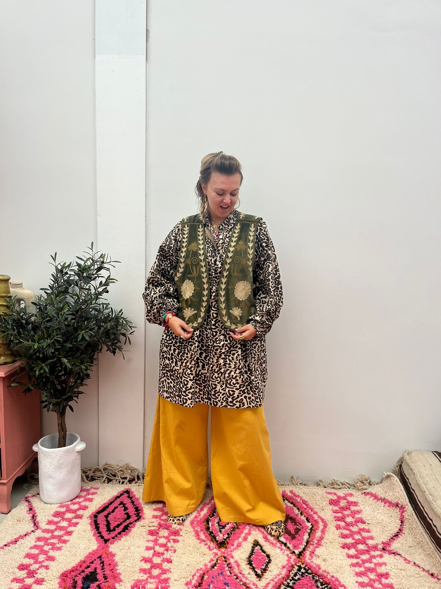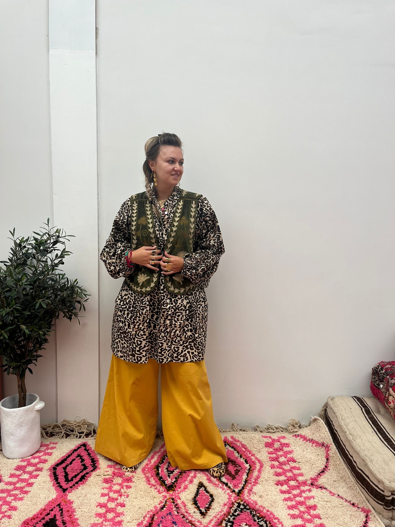 - Veelzijdig: Een Suzani-velvet gilet kan op verschillende manieren worden gestyled. Het kan worden gedragen over een eenvoudige jurk of top voor een vleugje boho-chic, of over een blouse en jeans voor een meer casual look.