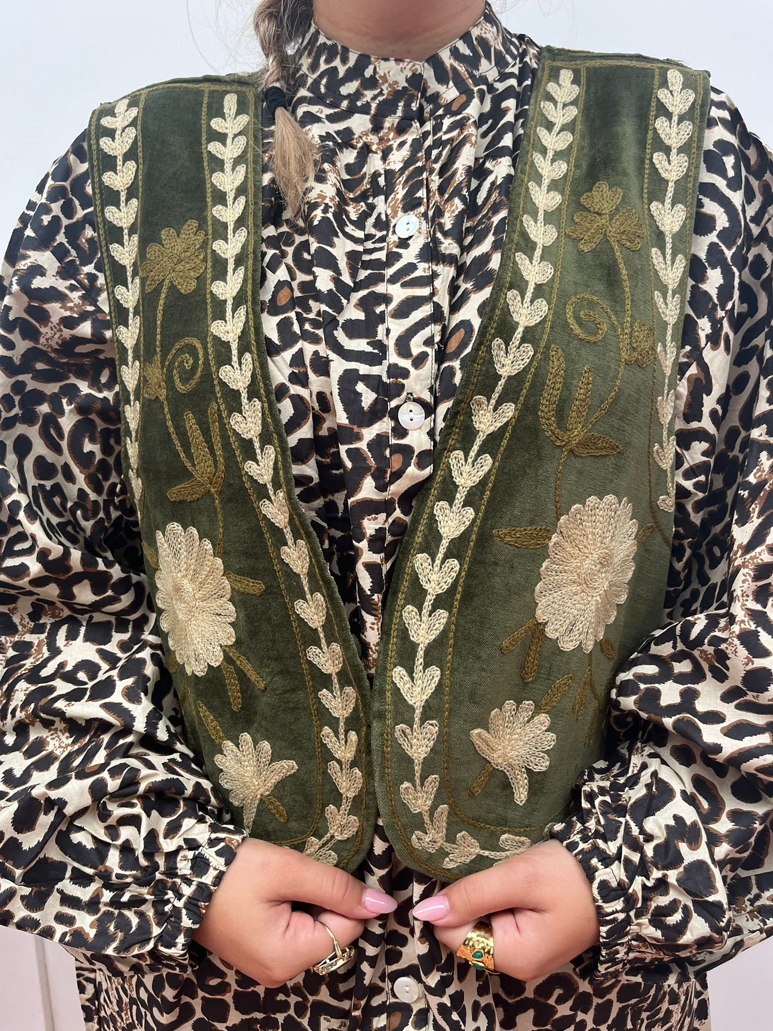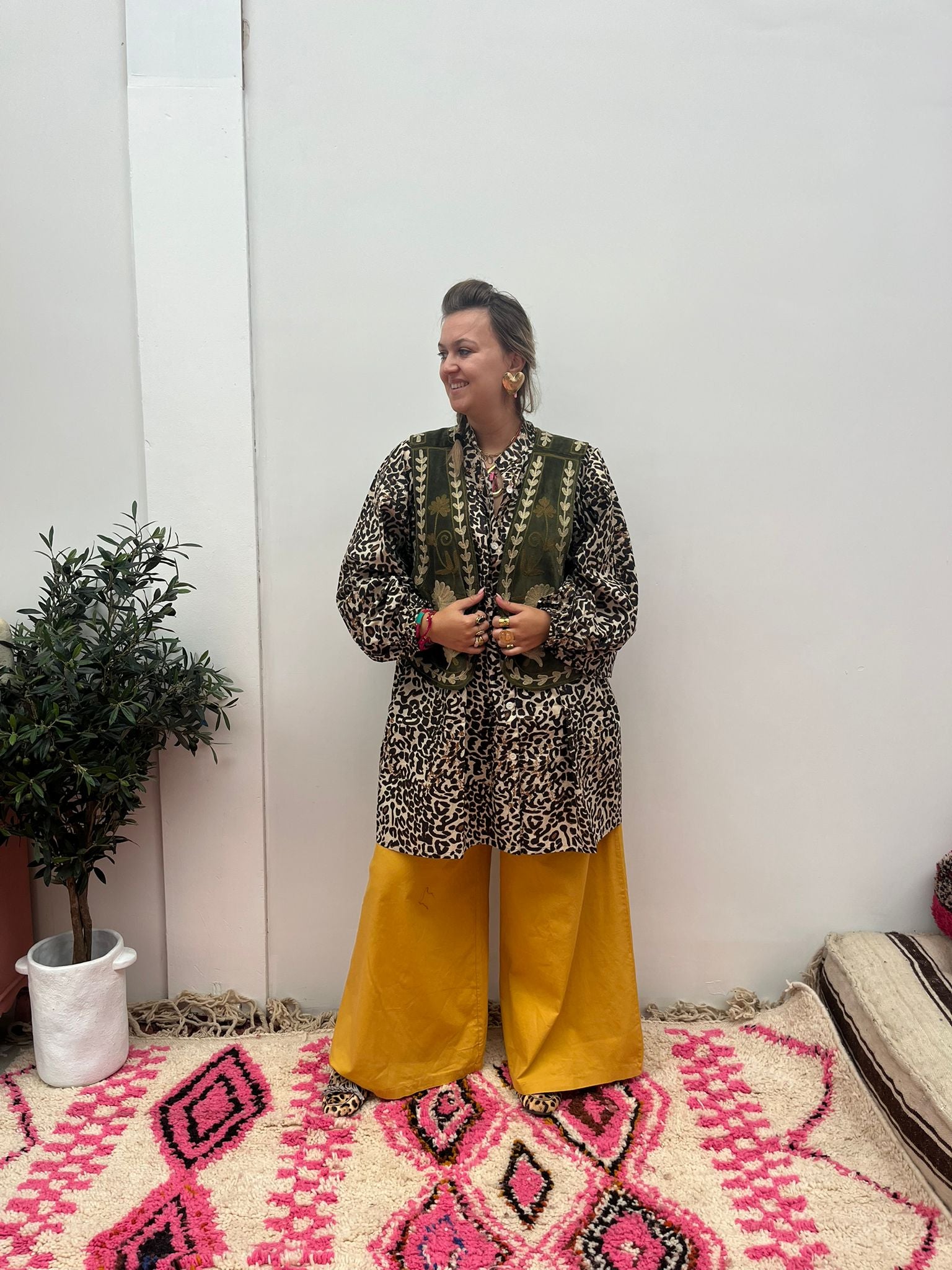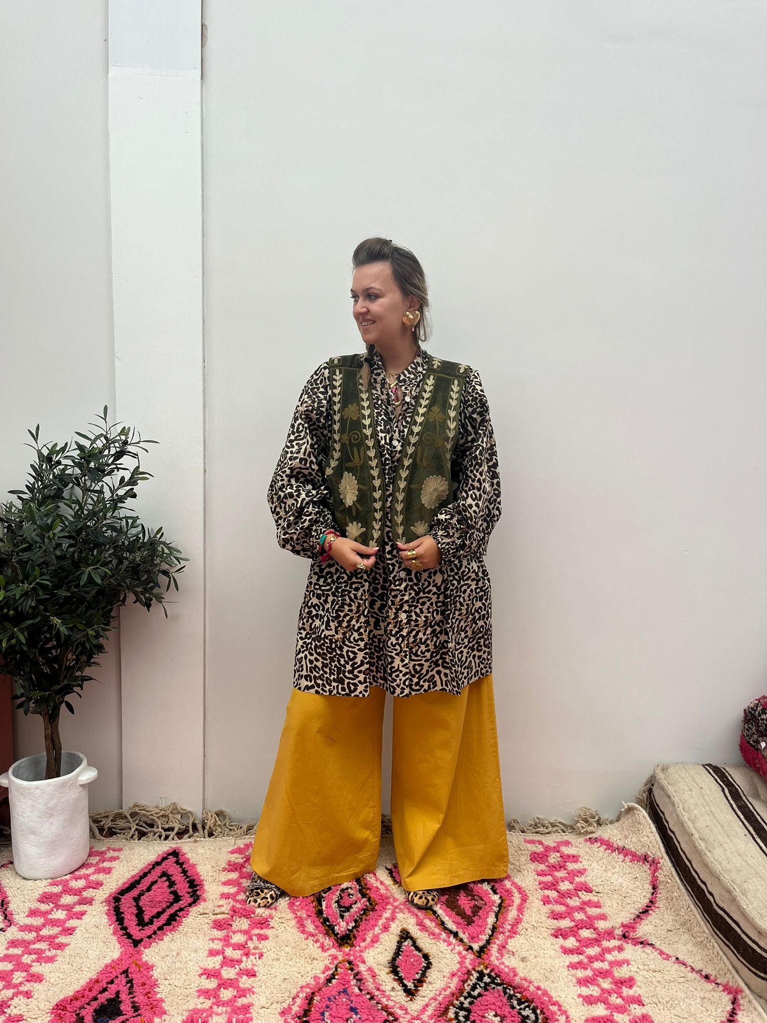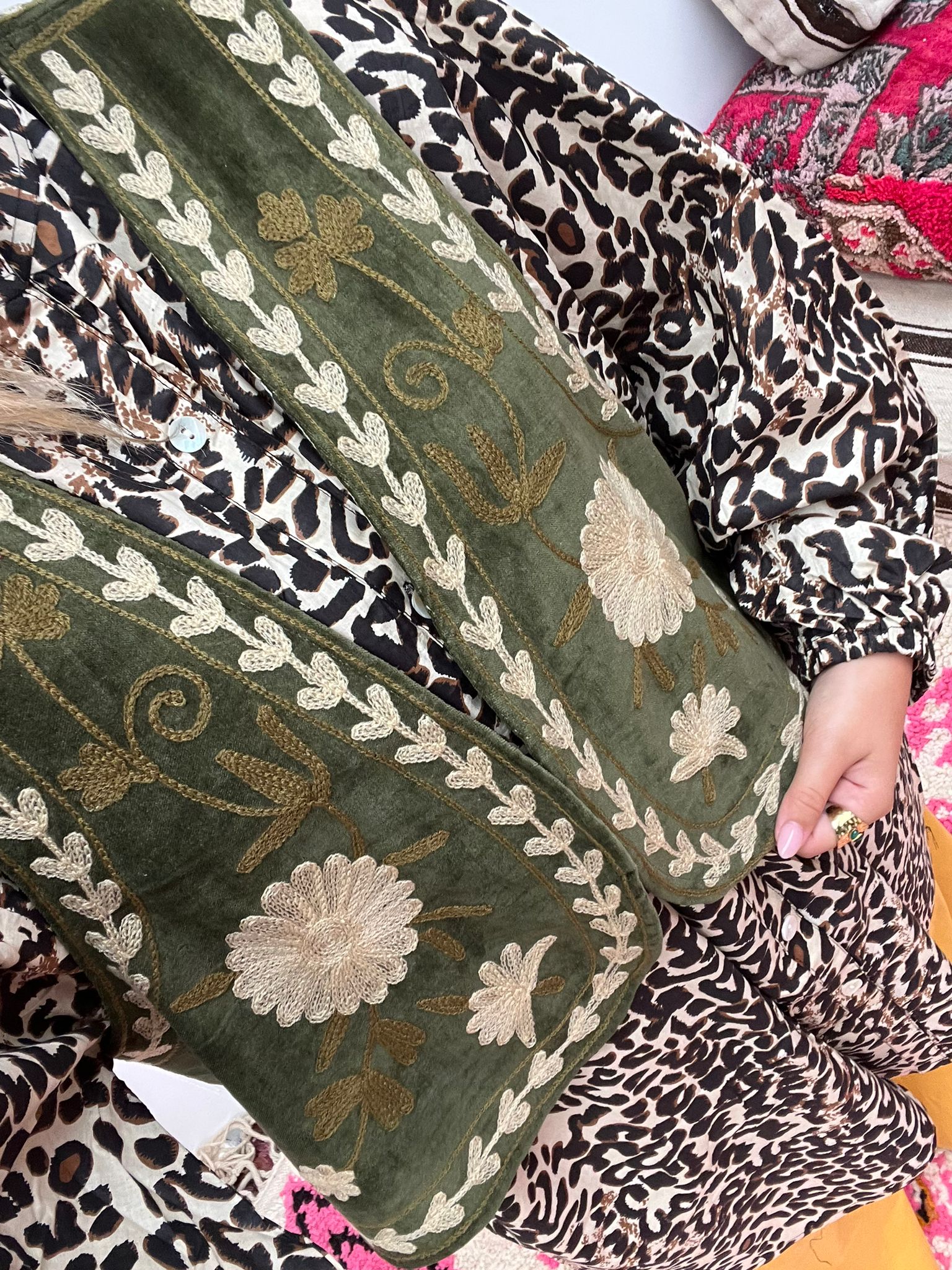 - Veelzijdig: Een Suzani-velvet gilet kan op verschillende manieren worden gestyled. Het kan worden gedragen over een eenvoudige jurk of top voor een vleugje boho-chic, of over een blouse en jeans voor een meer casual look.