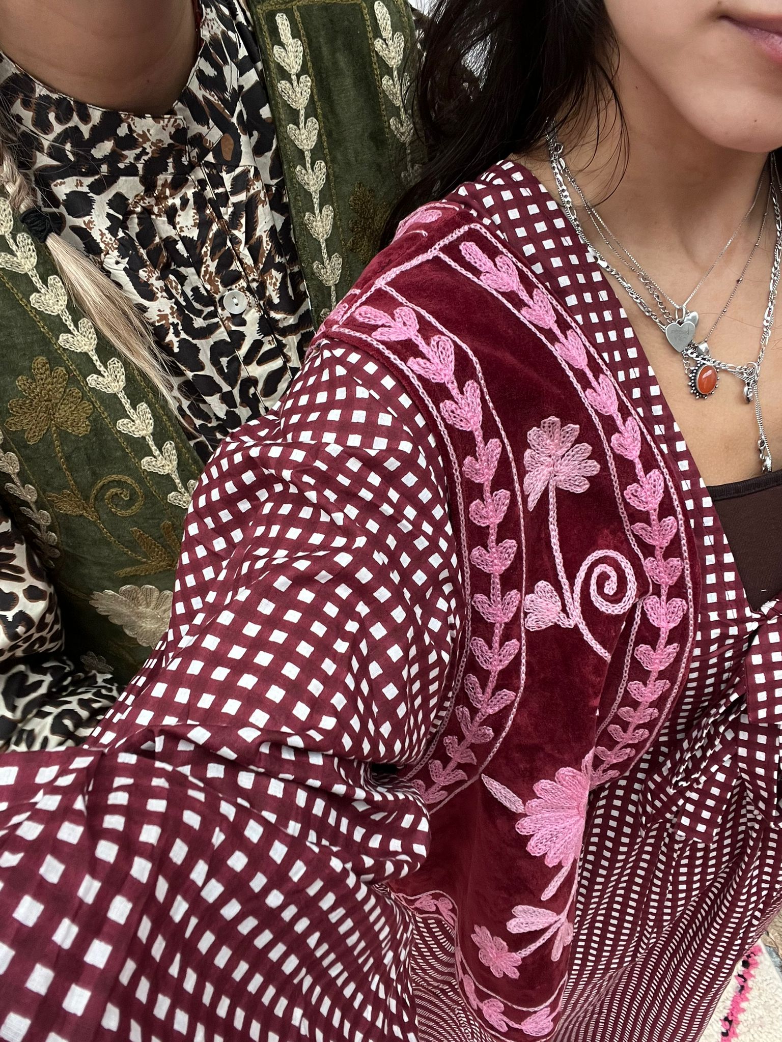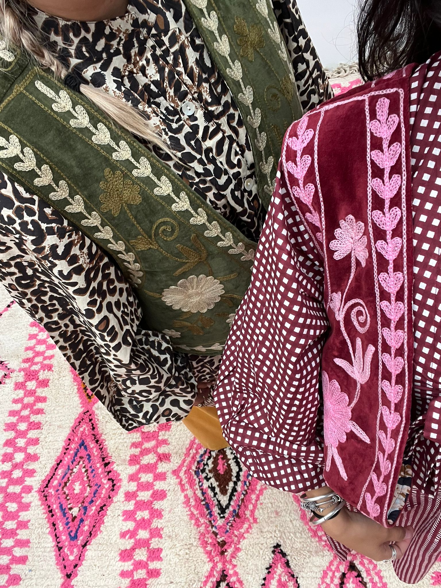 - Veelzijdig: Een Suzani-velvet gilet kan op verschillende manieren worden gestyled. Het kan worden gedragen over een eenvoudige jurk of top voor een vleugje boho-chic, of over een blouse en jeans voor een meer casual look.
