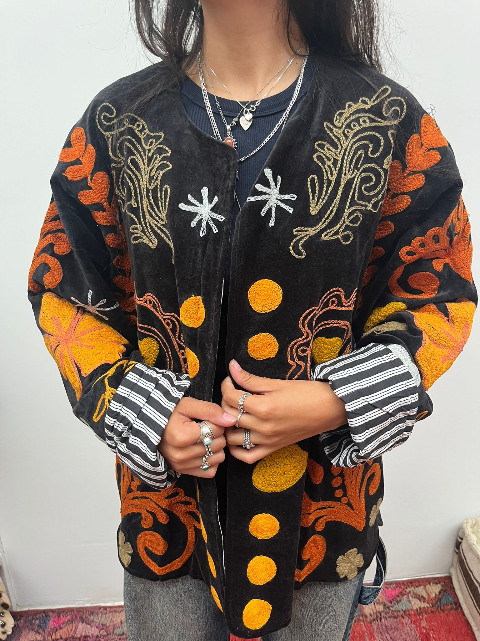 Velvet Jacket black orange yellow is met de hand gemaakt in India, speciaal ontworpen door ToutVintage en geschikt voor wie waarde hecht aan vakmanschap, duurzaamheid en karakter. Elk stuk is uniek en komt uit een gelimiteerde oplage van slechts 100 exemplaren.