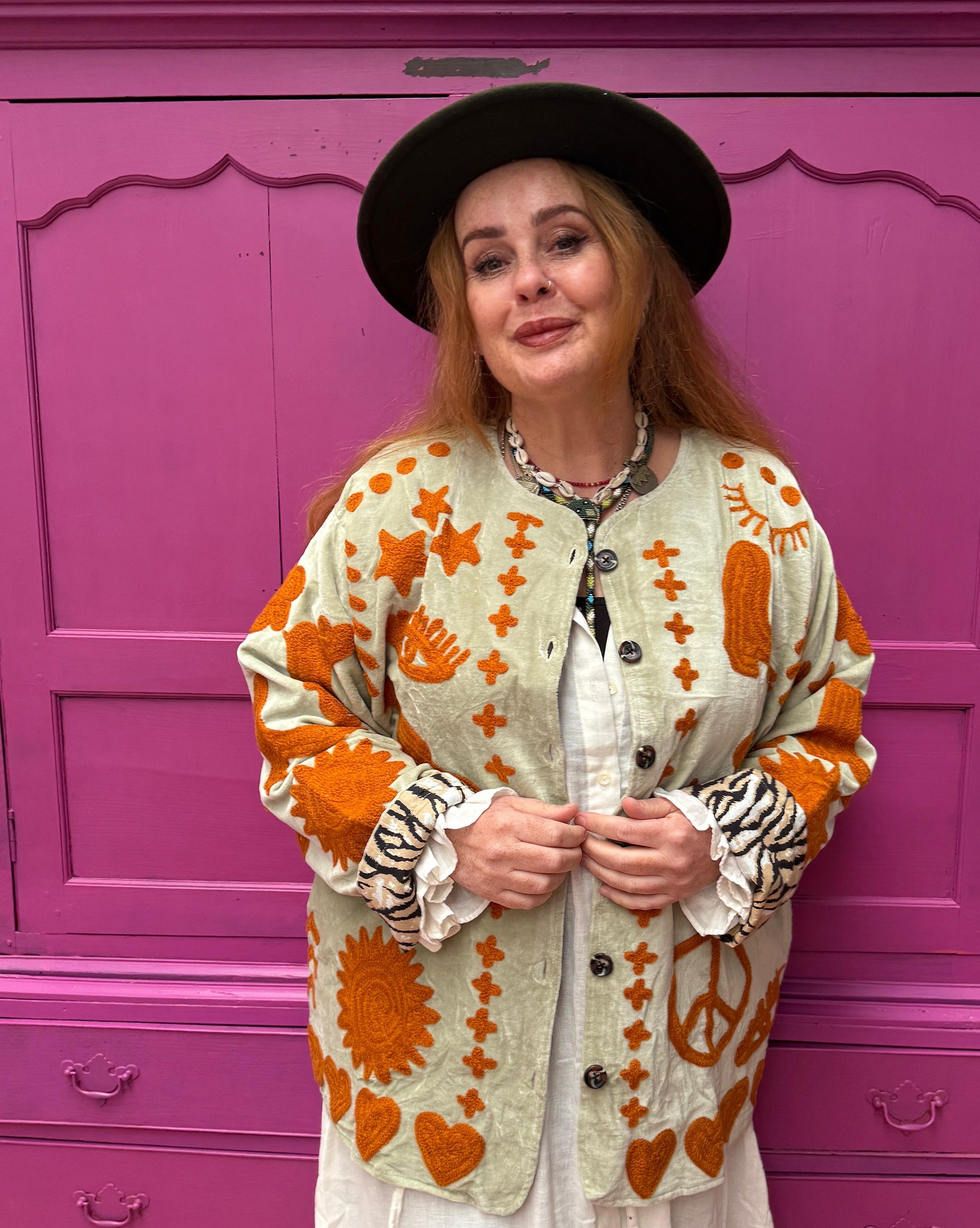 Dit jacket is gemaakt van velvet stof en geborduurd met de mooiste garen. Alles is zorgvuldig geselecteerd met respect voor mens en planeet.
